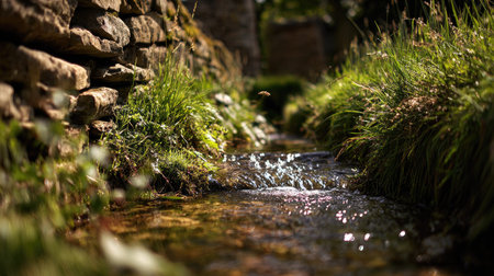 An historic stone structure featuring a gently flowing water source nestled amidst weathered brickwork, evoking timeless rustic charm and rural tranqu