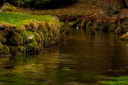 Top view of stream of clean spring water. Transparent stream, bubbles, green wet moss.