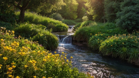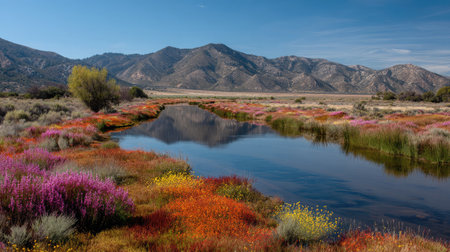 A picturesque river framed by vibrant wildflowers a rare and amazing sight to witness