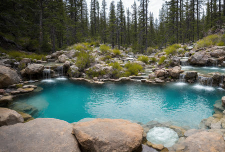 The bubbling natural hot spring pool is a hidden gem nestled in the heart of the wilderness, offering a rejuvenating oasis for weary travelers seeking solace.. AI generated.