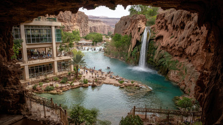 An aerial perspective showcases a canyon landscape featuring a cascading waterfall feeding into a body of water. The scene incorporates cliffs, greenery, and a building. Natural light illuminates the view, lending to potential commercial and editorial applications, offering visual appeal.