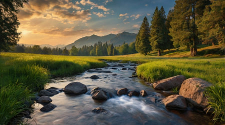 Landscape of grassland and mountain river at sunset in the mountains