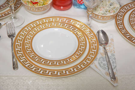Empty plate , gold set on wooden white table . Beautifully decorated table with gold plates, linen napkin , spoon, fork .
