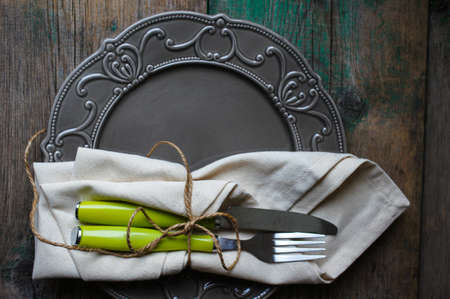Rustic table setting ith vintage metal plate and cutlery on dark wooden table