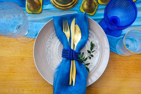 Modern tableware set with cutlery, glasses, and a vibrant blue plate, overhead flat lay shot. Trendy dinnerware on a tablecloth with copy space
