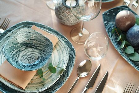 Beautiful elegant table setting with green stylish dishware and silver cutlery