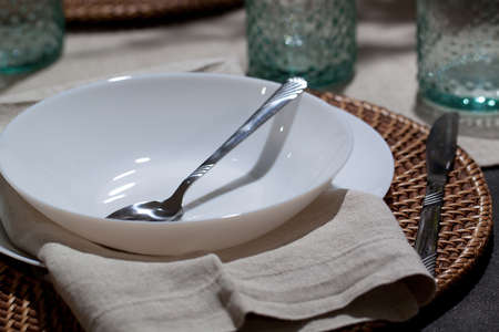 Dining table setting. Two gray plates with silver cutlery on the linen napkin. minimalist style.