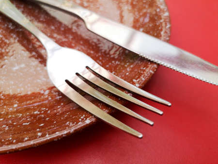 Tableware and dishware setting, plate, folk, knife on the gray background