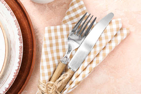 Spring festive table setting with plate napkin and cutlery on wooden table