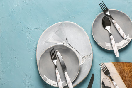 Clean, cutting board, glass and cutlery on blue plates grunge table