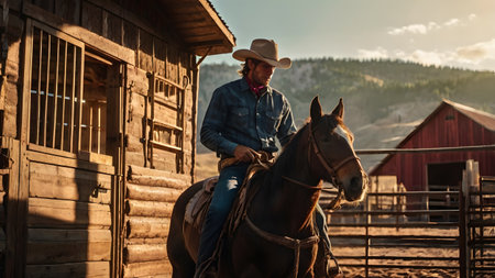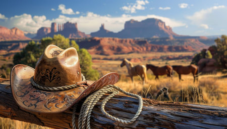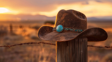 Experience a captivating sunset scene featuring a cowboy hat and lasso resting on a rustic fence, embodying the essence of the tranquil western lifestyle and outdoor adventure.