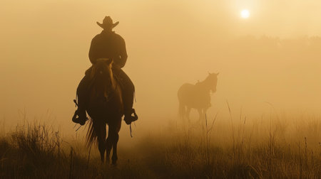 A stoic silhouette of a cowboy leading his trusty steed through the misty morning air