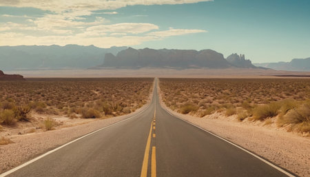 Vast Desert Road Perspective with Double Yellow Lines Leading to Distant Majestic Mountains Ahead