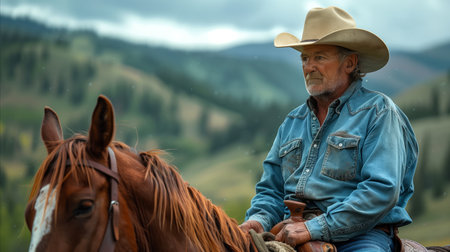 A rugged cowboy in a denim jacket sits atop a brown horse, gazing at a scenic mountain overlook, embodying the essence of the wild west.