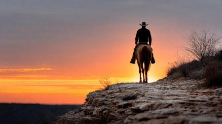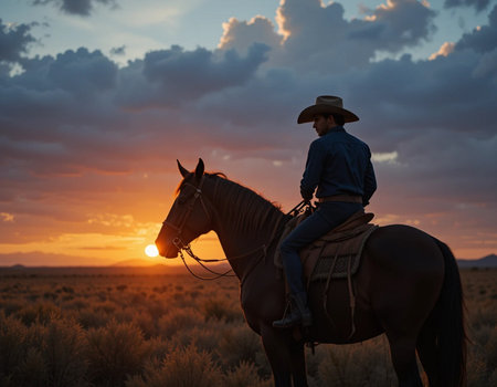 A stunning silhouette of a cowboy riding a horse against a vibrant sunset. The image captures the essence of freedom and adventure in a vast desert landscape.