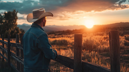 A man wearing a cowboy hat and a denim jacket, standing next to a rustic wooden fence, gazing into the sunset.