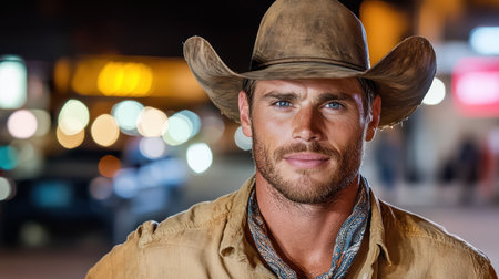 A close-up portrait of a rugged man wearing a cowboy hat, exuding strength and character with a dramatic backdrop.