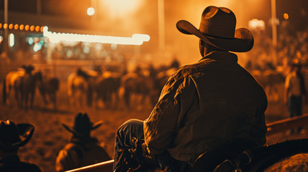 Generative AI A bustling scene at a rodeo, capturing the exhilarating moments as a cowboy competes in a thrilling event.