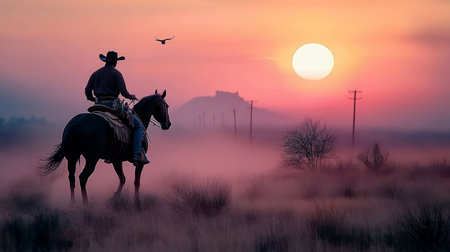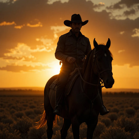 A striking silhouette of a cowboy on a majestic horse captured in dramatic light and shadow. The scene evokes feelings of tranquility, freedom, and adventure in a serene landscape.