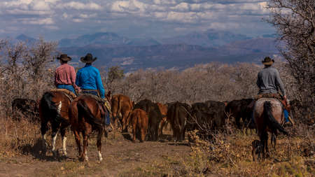 OCTOBER 2017, Ridgway, Col.orado: Cowboys on Cattle Drive Gather Angus/Hereford cross cows and calves of Double Shoe Cattle Company, Centennial Ranch, San Juan Mountains
