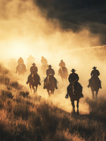 A group of riders on horseback moves through a dusty landscape at sunset, creating an enchanting silhouette that captures the essence of adventure and exploration.