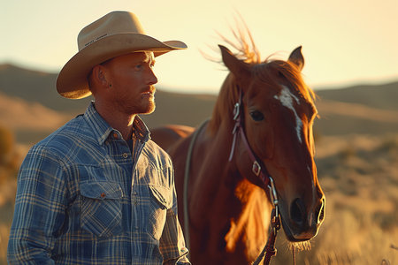 Generative AI Image of A Cowboy Man with His Horse in Meadow