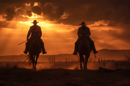 Silhouette of Cowboy Riding into the Sunset in a Dusty Western Scene