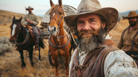 Man in cowboy hat smiling beside two horses in picturesque landscape