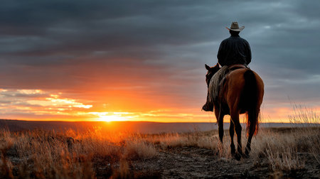 A lone cowboy on horseback gazes at a vibrant sunset, surrounded by an expansive prairie. The scene captures the essence of adventure and tranquility in nature.