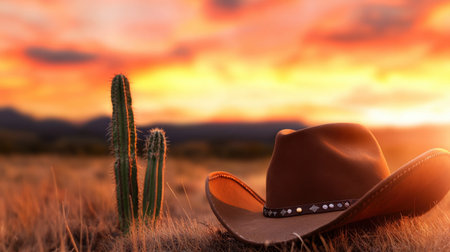 Dusty cowboy hat and tall cactus in a prairie field with the sky glowing orange and red