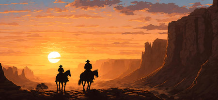 Illustration of two cowboys riding horses in the desert at sunset