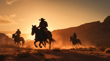 Silhouettes of cowboys riding horses at sunset