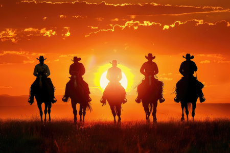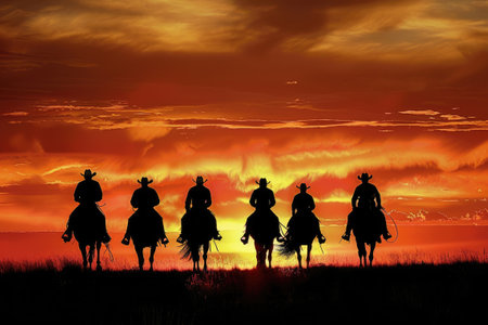 Silhouetted group of cowboys riding horses into the sunset on an open plain.