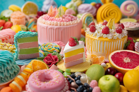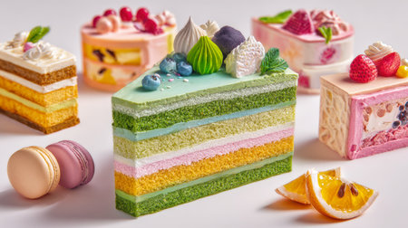 slice of a multi-layered cake featuring colorful sponge and frosting, presented in foreground. On background various other cakes, macarons, candied fruit slices, gourmet desserts.
