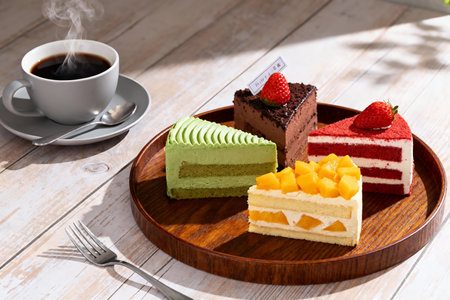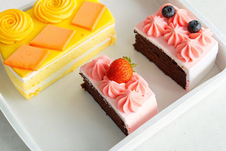 An elegant display of assorted cakes topped with fresh fruits and creamy layers, perfect for celebrating special occasions and satisfying sweet cravings.
