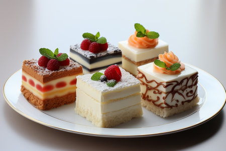 Collection of various cakes on wood background. Assortment of pieces slices with cream. Plate with different types of sweets. Several slices of delicious desserts. confectionery menu concept