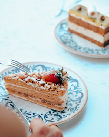 Festive cake. Portion of cake. A piece of cake lies on a wooden table.