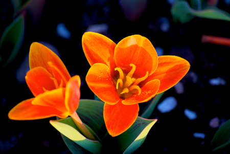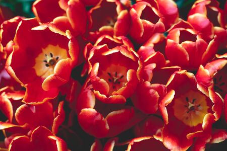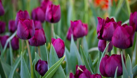 Closeup of red-orange tulips flowers with green leaves in outdoor. beautiful flowers in spring