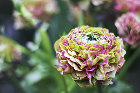 Pink and Green Pon Pon Ranunculus on the background of defocused garden with copy space for text or design