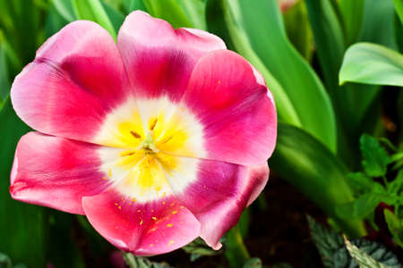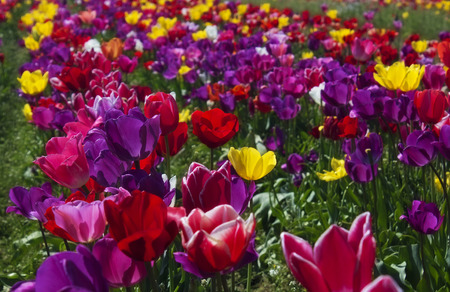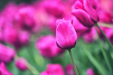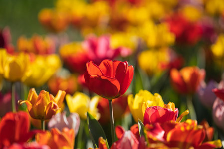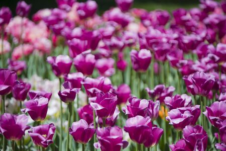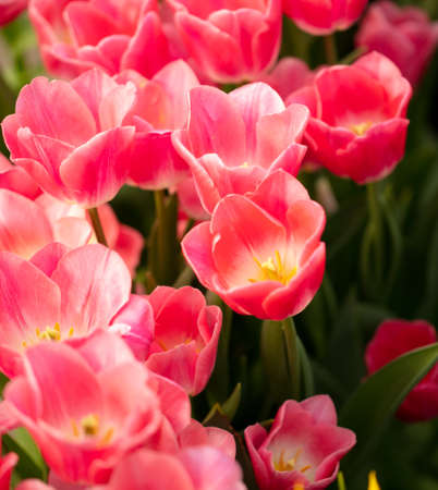 Colorful tulip field, summer flowerwith green leaf with blurred flower as background