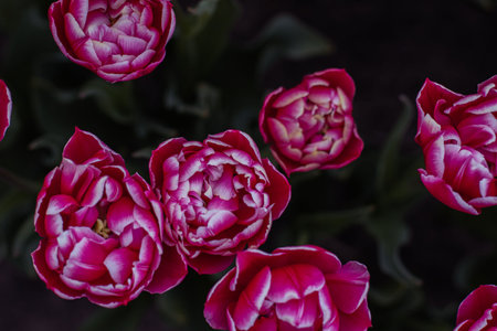 Beautiful colorful terry tulips blooming in the garden, close-up view. Natural floral texture for background.