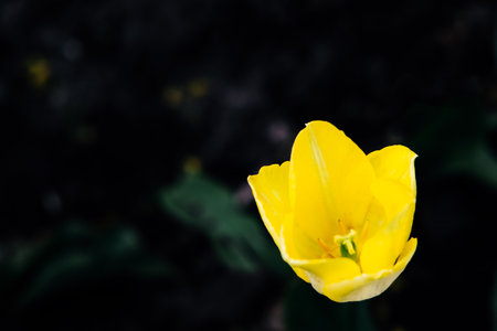 A vibrant yellow tulip stands out in a dark garden surrounded by green foliage illuminating the spring atmosphere.