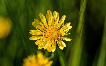 Yellow dandelion flower on a green background closeup.