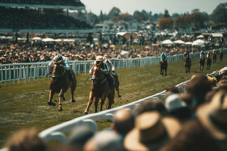 Two racing horses gallop toward a barrier with their jockeys in full competition during a crowded race at the hippodrome. Spectators cheer from the stands enjoying the excitement of the sport.