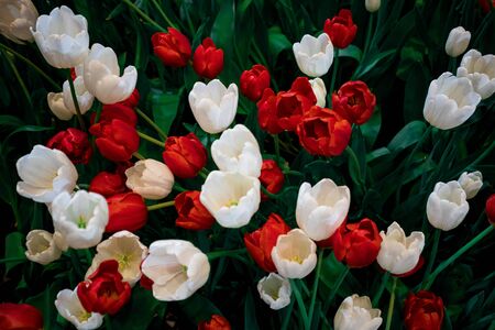Glade of white-burgundy tulips. Natural background for your projects.
