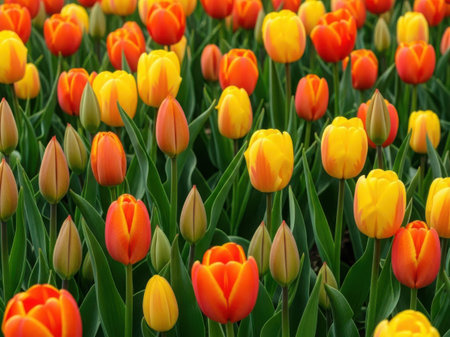 A close-up view of a lush field filled with bright orange and yellow tulips in various stages of bloom, surrounded by green stems and leaves.