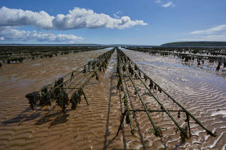 Some oyster beds at the coast in Ireland at low tide. cloudy sky