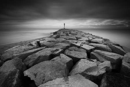 A rocky breakwater overlooking the gulf of Gdansk near the beach at Westerplatte at sunset. Gdansk, Poland
