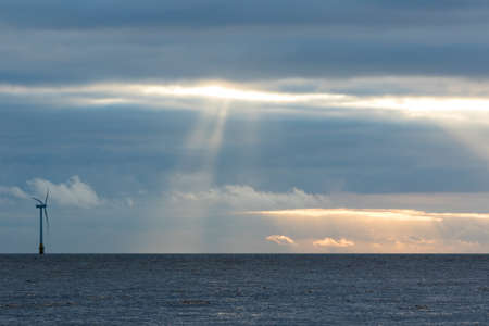 Renewable energy. Sustainable resources. Beautiful sky seascape background image. Shining light between clouds. Sea horizon with solitary offshore wind turbine Tranquil new age natural world landscape