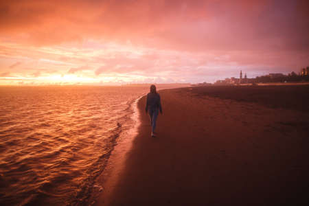 A view from behind a girl walks alone on the city beach and looks at the colorful sunset after the rain. Orange, crimson purple colours